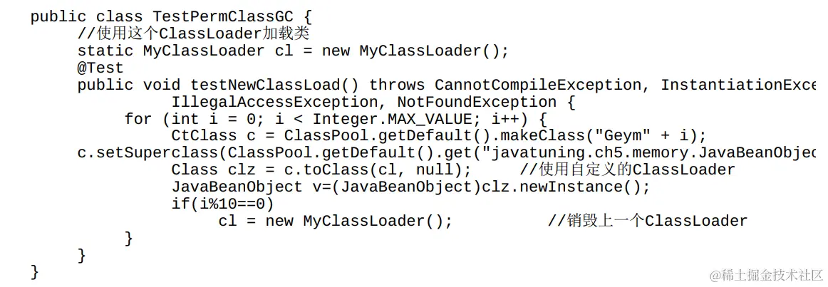 与前一个例子相比,以上代码引入了一个自定义的ClassLoader,并使用该ClassLoader加载所有的动态类。每个ClassLoader加载10个动态类后,其引用的cl变量便被设置为null,使得虚拟机可以回收这个ClassLoader的实例。