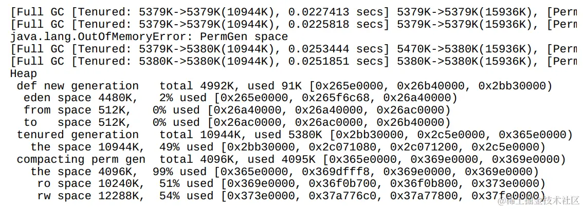 使用JVM参数“-XX:PermSize=2M-XX:MaxPermSize=4M-XX:+PrintGCDetails”运行以上代码,部分输出结果如下: