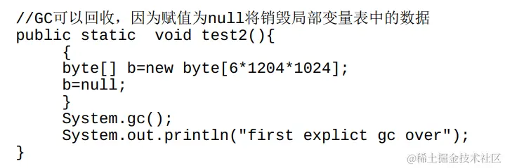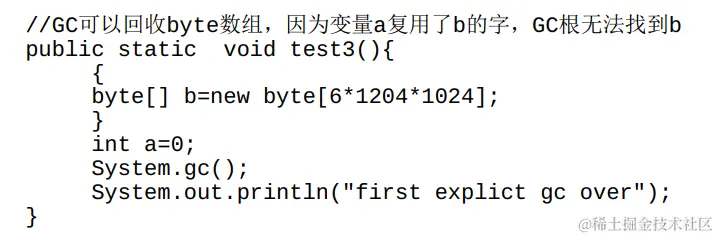 在实际开发中,遇到上述情况的可能性并不大。因为在多数情况下,如果后续仍然需要进行大量的操作,那么极有可能会声明新的局部变量,从而复用变量b的字,使b所占的内存空间可以被GC回收。以下代码演示了这种可能: