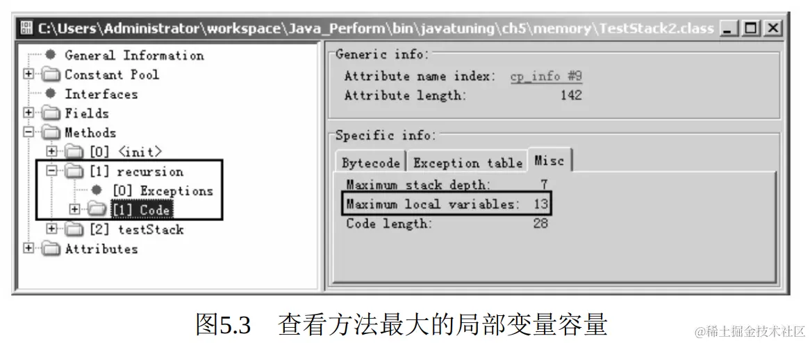 使用JClassLib打开上例中的TestStack2.class文件,可以看到recursion()方法,将其展开后查看Code属性,在Code属性的Misc页面,可以看到当前方法的最大局部变量表容量。如图5.3所示,可以看到,TestStack2.recursion()方法的最大栈容量为13。因为该方法有3个long型参数,并在方法体内又定义了3个long型变量,共占12字,外加this变量作为参数,故最大的局部变量表为13字。