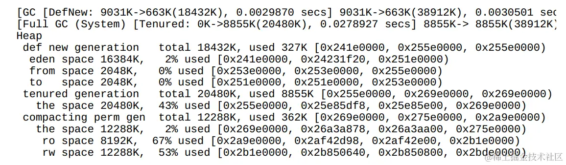 可以看到,在执行FullGC操作之后,新生代空间被清空,未被回收的对象全部被移入老年代(tenured)。