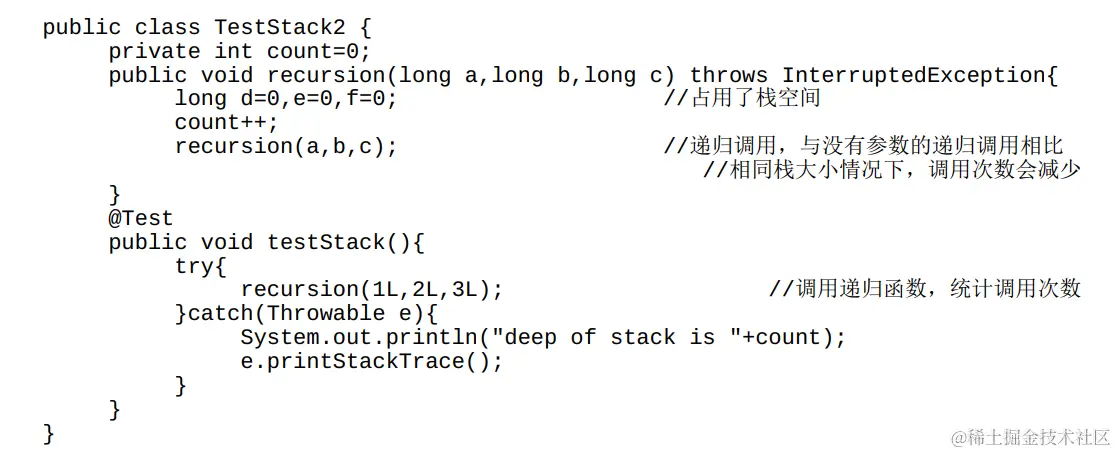 以下代码的递归函数recursion()定义了多个传入参数和局部变量,因此它的栈帧大小就会膨胀。