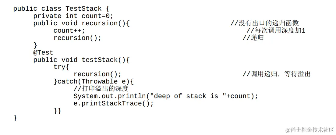 以下代码演示了一个递归调用的应用。计数器count记录了递归的层次,这个没有出口的递归函数一定会导致栈溢出,程序在栈溢出时打印出栈的当前深度。