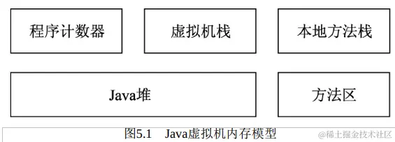 Java虚拟机内存模型是Java程序运行的基础。为了能使Java应用程序正常运行,JVM虚拟机将其内存数据分为程序计数器、虚拟机栈、本地方法栈、Java堆和方法区几部分,如图5.1所示。