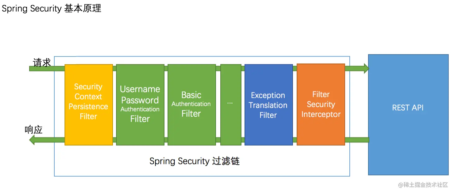如上图,一个请求想要访问到API就会以从左到右的形式经过蓝线框框里面的过滤器,其中绿色部分是我们本篇主要讲的负责认证的过滤器,蓝色部分负责异常处理,橙色部分则是负责授权。