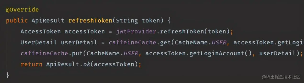 JWT的项目token刷新也是必不可少的,这里刷新token的主要方法放在了token工具类里面,刷新完了把缓存重载一遍就行了,因为缓存是有有效期的,重新put可以重置失效时间。
