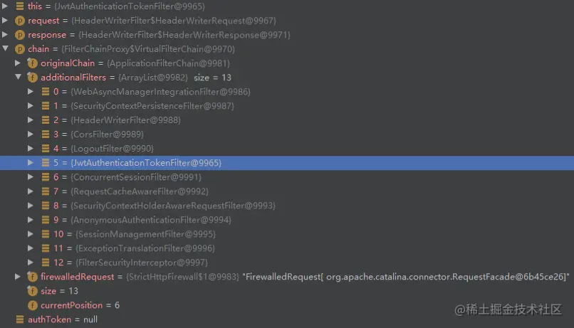 完成之后,启动我们的demo,可以看到过滤器链中有以下过滤器,其中我们自定义的是第5个: