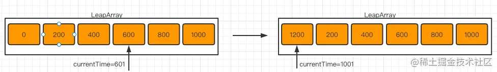 - 当前时间所落窗口不存在 通过时间戳计算应该落在LeapArray的位置构建时间窗 并记录时间窗的开始时间用于下面判断窗口过期复用。