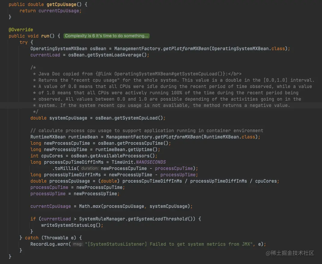 - 对于CPU Load 指标的获取,这里出于对性能的考虑没有选择实时获取,而是使用秒级定时任务去定时获取计算,计算值主要依赖于OperatingSystemMXBean