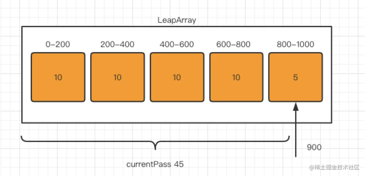 下图为5个桶的时间窗口在第900ms时限流为50需要获取25个令令牌