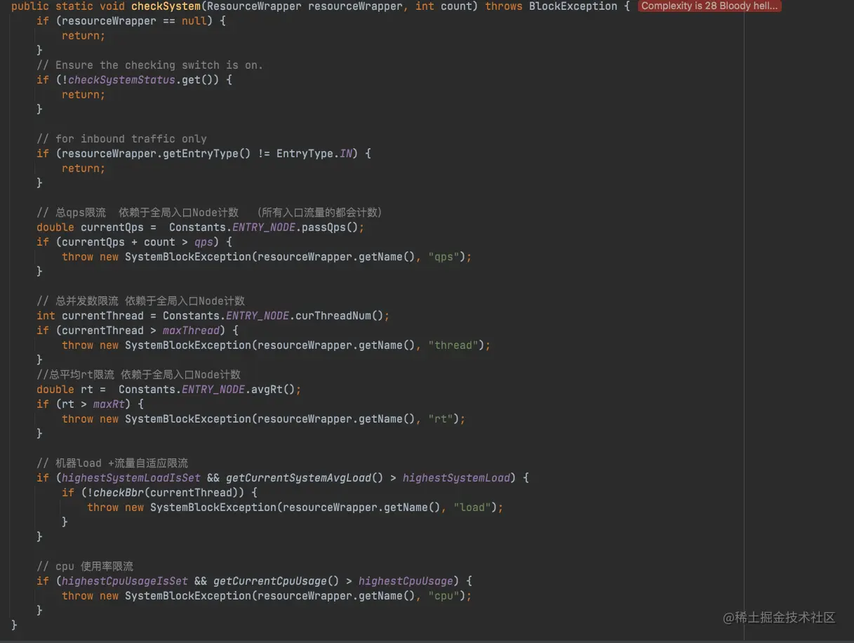 系统自适应限流其实和上面的算法其实不是一个纬度的,但是在我们写文章的时候有同学想了解相关内容,所以我们就在文章最后加个餐。系统保护规则是从应用级别的对入口流量进行控制,主要针对机器的 Load、RT、入口 QPS 和线程数四个维度监控指标,让系统尽可能跑在最大吞吐量的同时保证系统整体的稳定性。