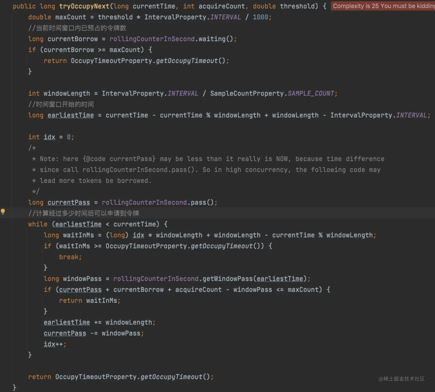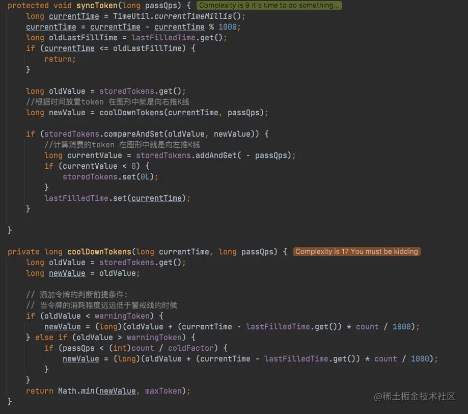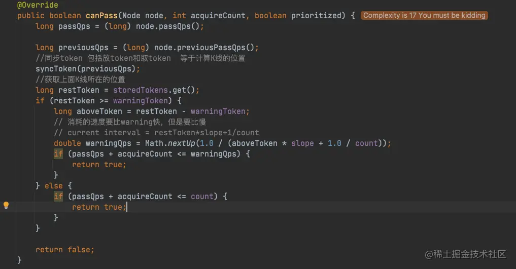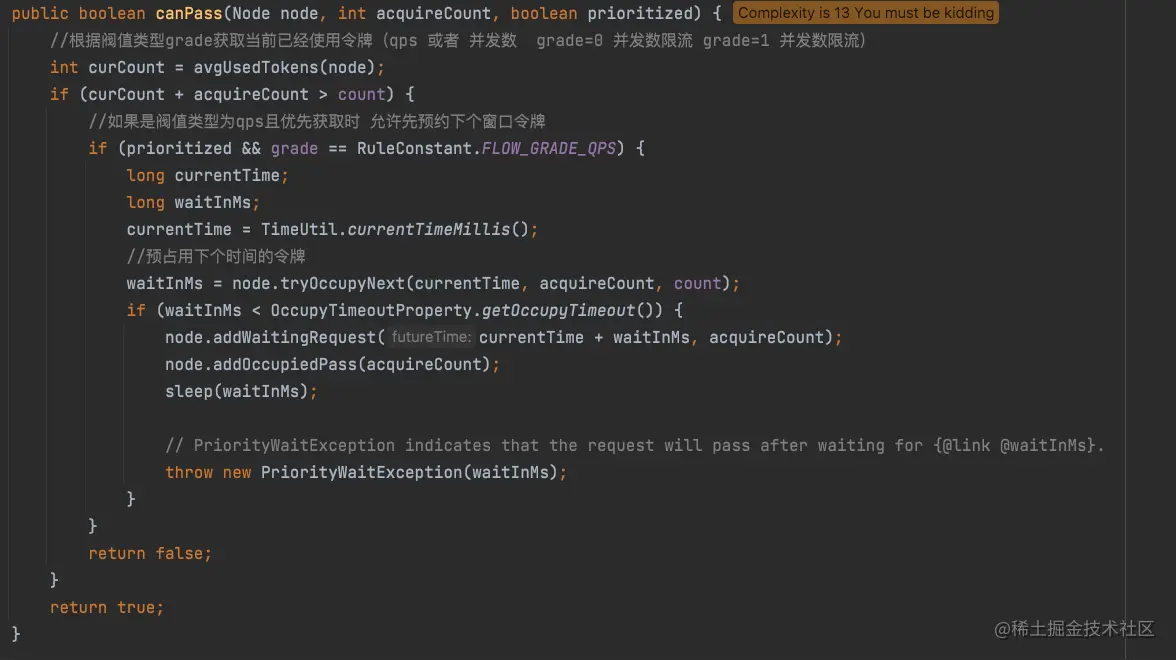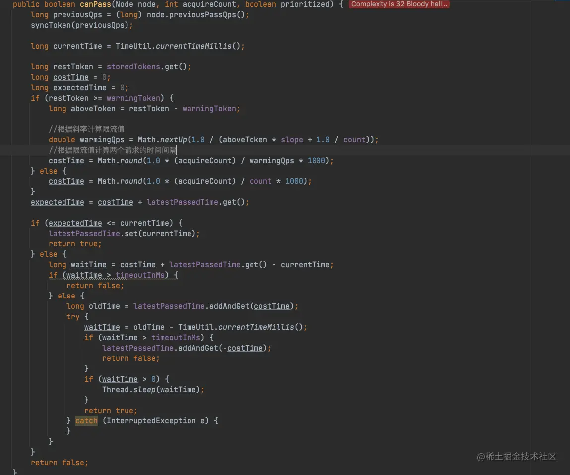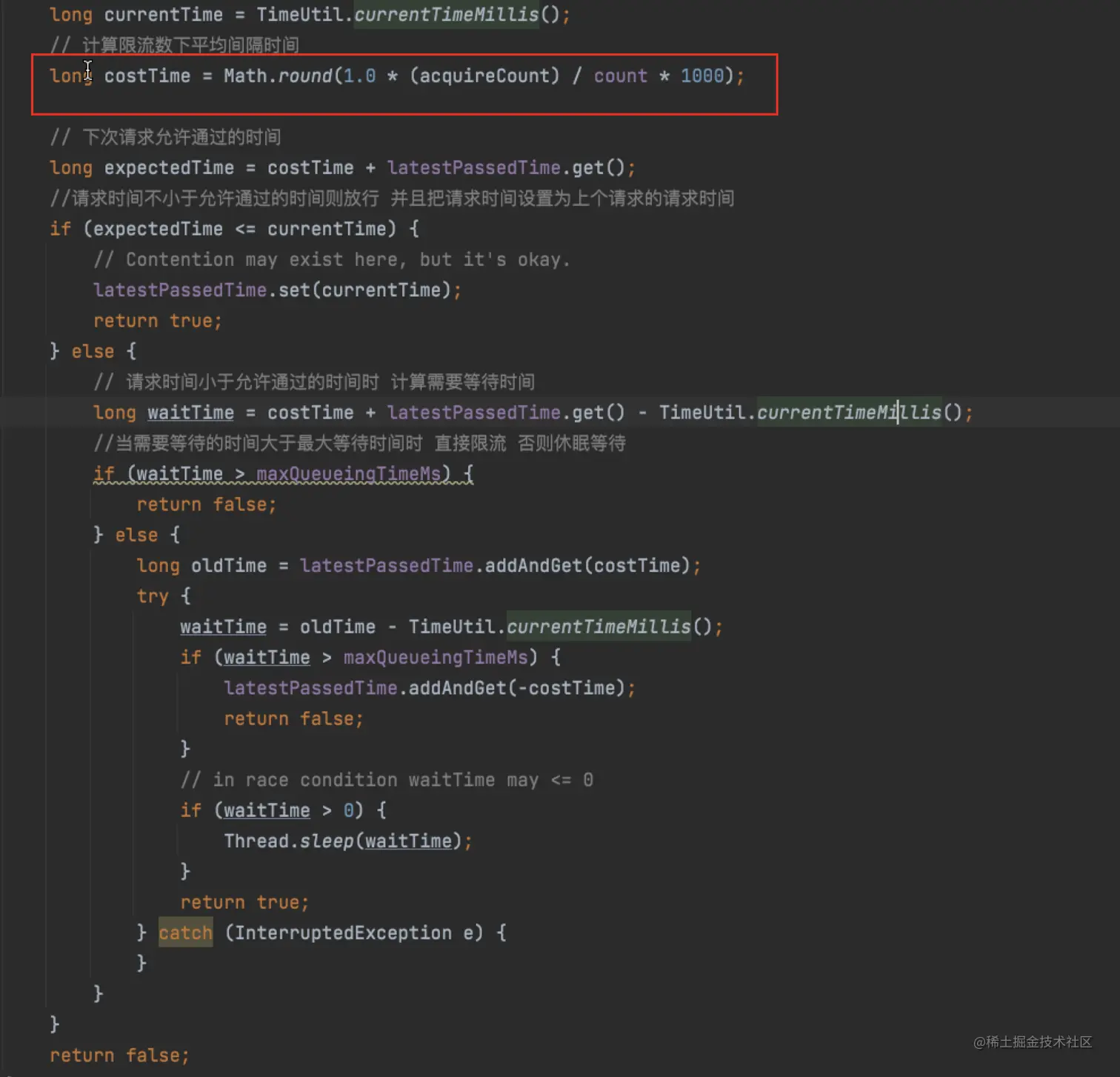查看限流逻辑其实很容易发现,这里计算限流值的方式基本上和我们上面WarmUpController一样,但是需要在计算完限流值后把限流值转换为请求间隔,转换到时间间隔后的逻辑就到了计算等待时间了,关于计算等待时间间隔部分不能说和RateLimiterController不能十分相似,也可以说一摸一样了,都是判断当前时间是否大于预期通过时间,只是这个时间间隔时会WARM UP的。