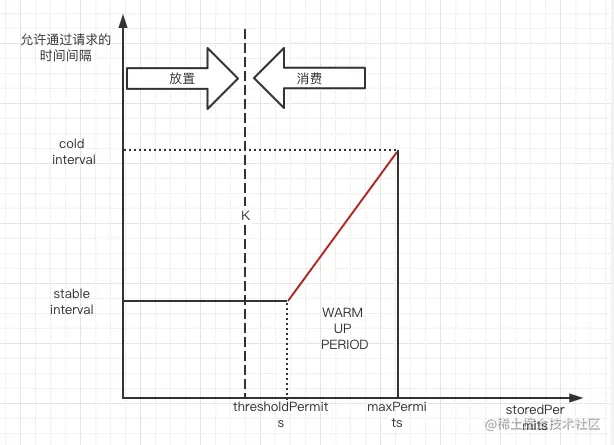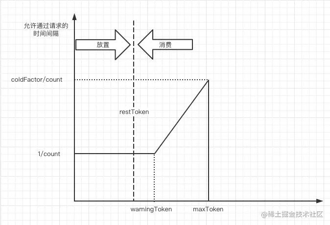 在坐标系中横坐标为此时存储的令牌permit,纵坐标是允许通过请求的时间间隔interval也就是1/count。随着时间的推移放置的 令牌=tcount, t=intevalpermit 整个过程K线会随着时间放置permit右移随着permit消耗左移。当K线在maxPermits和thresholdsPermits之间时流量处于Warm Up状态这个时间就是warmupPeriod在图像中就是梯形的面积。随着继续消耗K线会介于thresholdsPermits之间这时流量已经完成Warm Up。