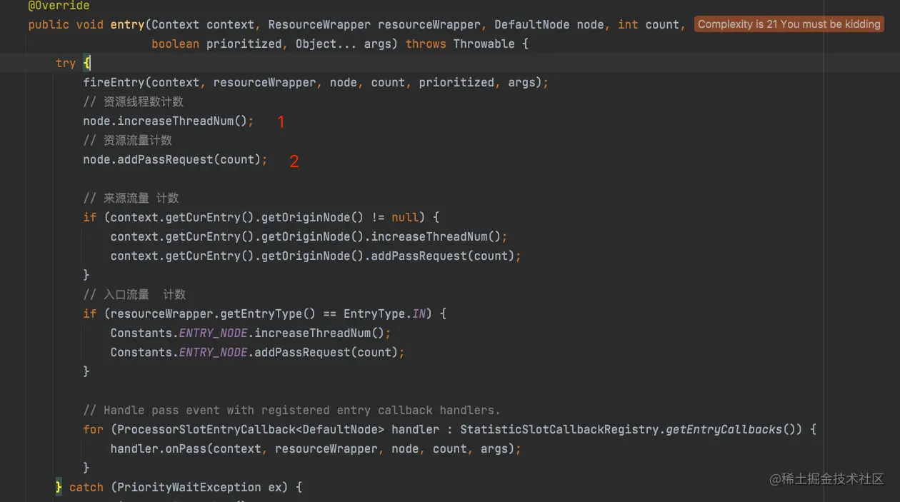 StatisticSlot 是限流的基石基本上后续限流所依赖的数据都在这里统计,下面我们只展开了 我们标红的两个计数,是因为下面的其他计数只是选取的计数node不同地层原理是一致的。