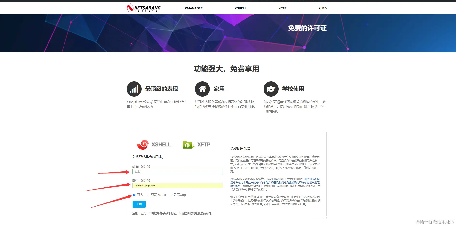 Xshell与Xftp的家庭与学生免费版下载 天界程序员 2022-09-19 388 阅读1分钟 Xshell与Xftp的家庭与学生免费版下载 1、进入官方网址👆:www.netsarang.com/zh/ 2、点击首页【下载】按钮🧐 3、进入软件下载列表🤔 4、点击【xshell】或者【xftp】的【下载】按钮🤠 5、点击上图【免费授权页面】链接🤓 6、填写你的姓名和邮箱,勾选【两者】,然后点击【下载】按钮😯 7、进入邮箱里面点击下载链接👆 8、得到两个宝贝后,双击鼠标左键安装,大功告成!😎