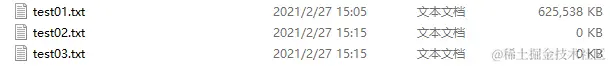 现有三个文本文件,其中test01.txt 大小约为 610M,test02/test03均为空文本文件