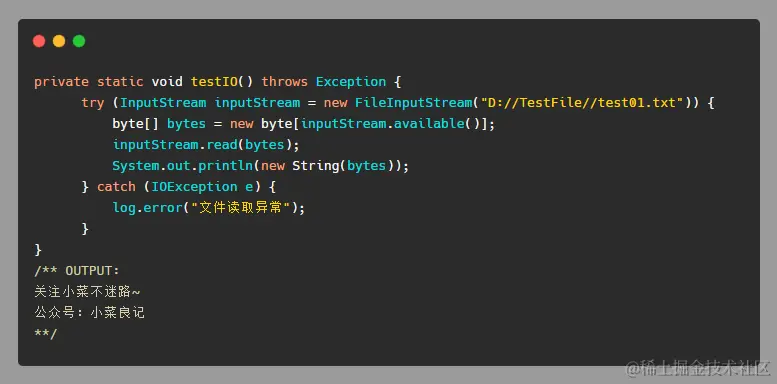 我们得借助一个 byte 数组来接收读取到值,然后转为字符串类型。