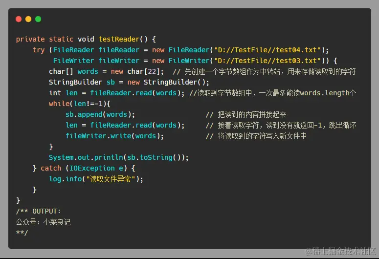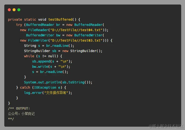 按我们理解调用两次该方法,文本文件中的内容应该是两行 公众号:小菜良记,但是实际上只用一行,这是因为后面写入的内容会覆盖前面已经存在的内容,解决方法便是在构造函数的时候加上append = true