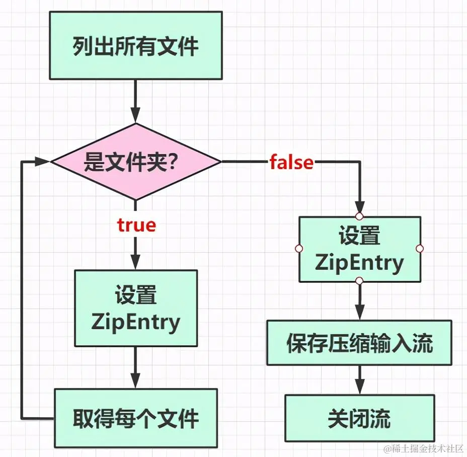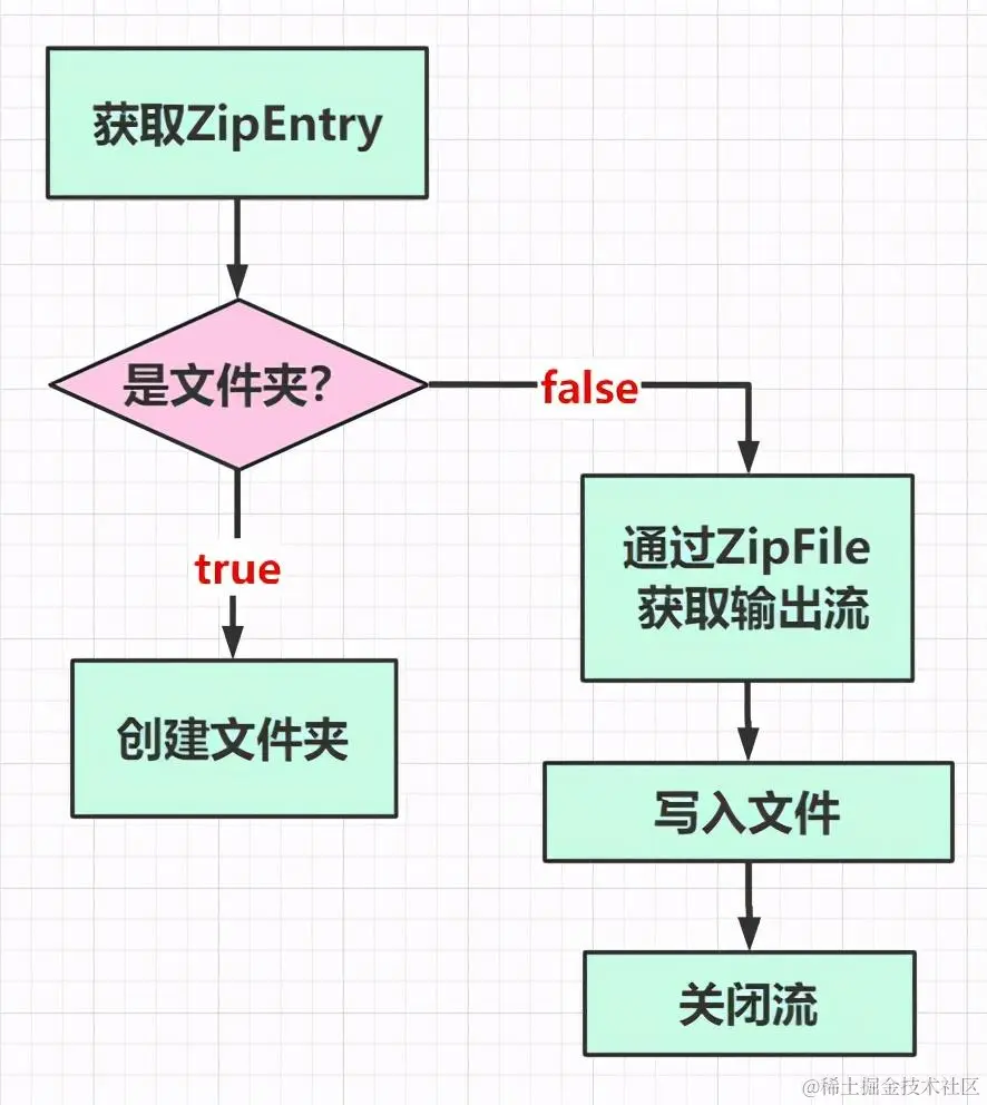 每次都会遍历完一个目录下的所有文件,例如 dir01 文件夹下的所有文件,才会继续遍历 dir02 文件夹,所以我们不必使用递归的方式去获取所有文件。取到每一个文件后,通过 ZipFile获取输出流,然后写入到解压后的文件中。大致流程如下: