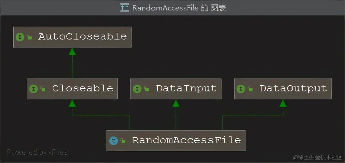 我们从图中可以看到 RandomAccessFile 并非继承于 InputStream 和 OutputStream 两个接口,而是继承于有些陌生的DateInput 和 DataOutput。