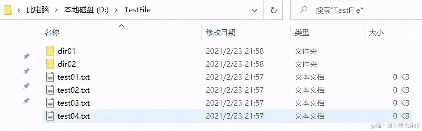 已知我们 D 盘目录下有个 TestFile 文件夹,该文件夹下有以下文件: