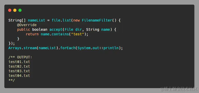 同样是一个接口,同样需要重写 accept() 方法,但是这个方法只有一个 File 的参数。因此这两个参数都是用于文件过滤的,功能大同小异~
