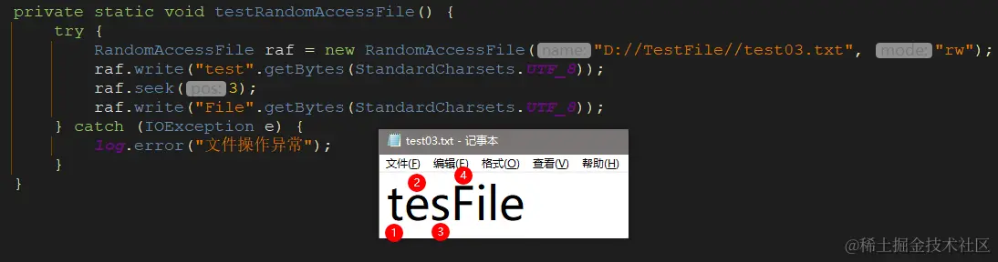 我们首先从此文件中写入了test 四个单词,然后将头指针移动3位后继续写入File四个单词,结果就变成了testFile,这是因为移动指针后是以第四个位置开始写入。