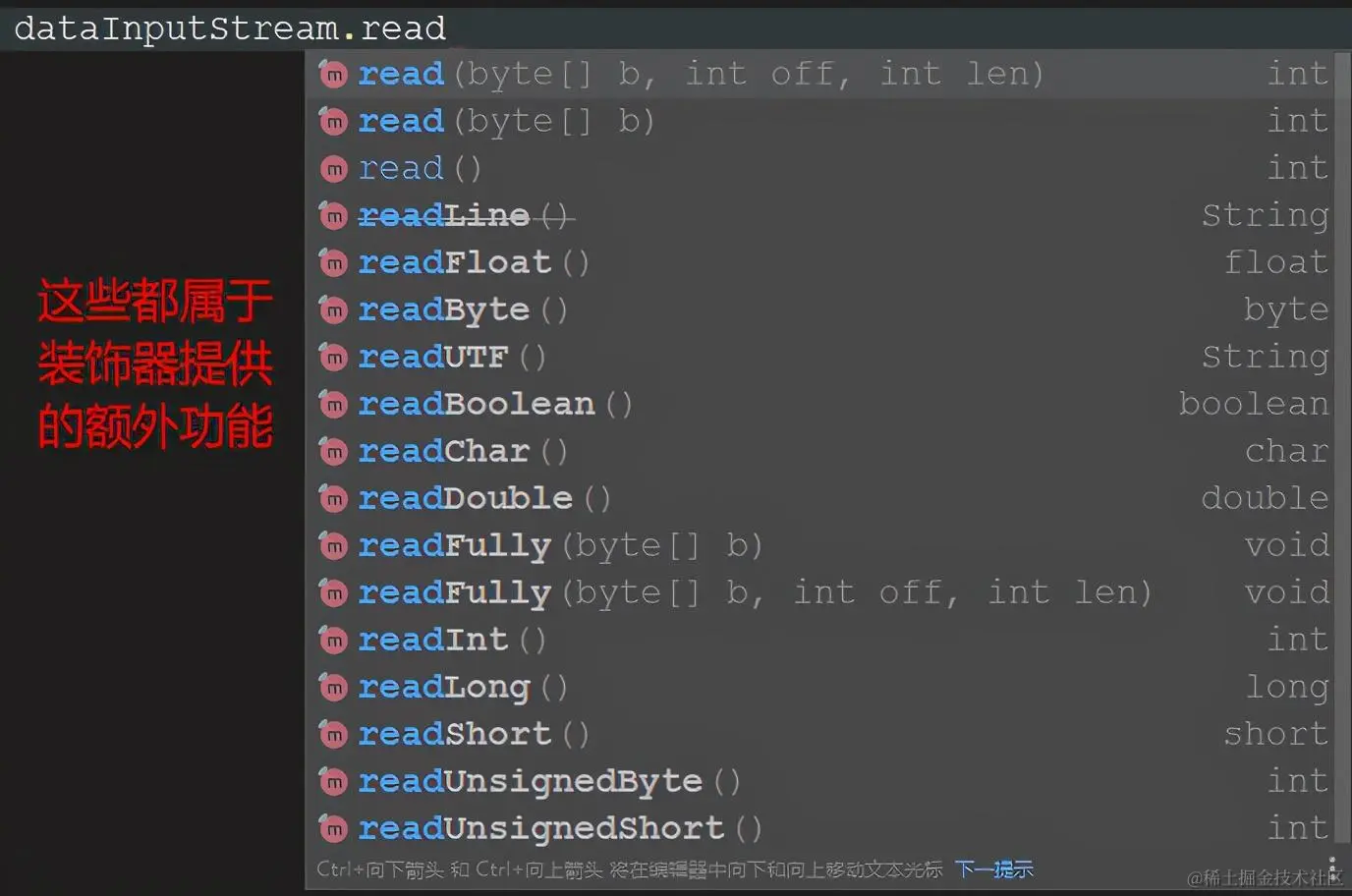 其中DataInputStream允许我们读取不同的基本数据类型数据以及String对象,搭配相应的DataOutputStream,我们就可以通过数据"流" 将基本类型的数据从一个地方迁移到另一个地方。
