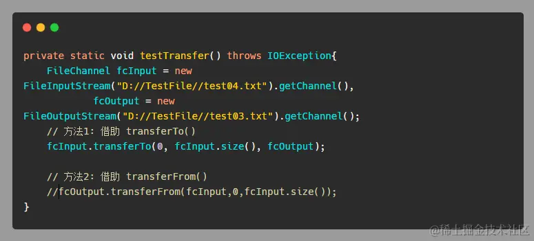 程序员往往都是比较懒惰的,上面那种读取后再通知 FileChannel 的方式似乎有些麻烦。那么有没有更加简单的方法?肯定是有的,不然我也不会问是吧~ 那就是让一个通道与另外一个通道直接相连接,这就得借助特殊的方法transferTo() 和 transferFrom() 。具体使用如下: