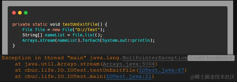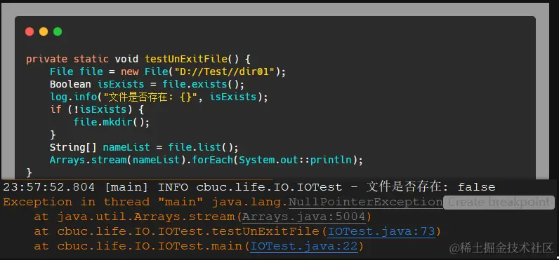 结果便是抛出异常了,的确抛出异常才是正常的现象,针对一个不存在的文件目录进行操作岂不是瞎胡闹