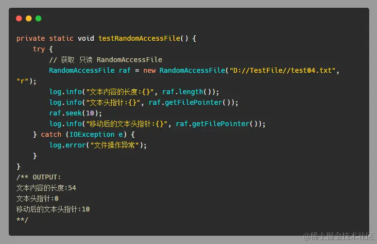 从本质上来说,RandomAccessFile 的工作方式类似于把 DataInputStream 和 DataOutputStream 组合起来使用,还添加了一些方法,其中方法getFilePointer() 用于查找当前所处的文件位置,seek() 用于在文件内移至新的位置,length() 用于判断文件的最大尺寸。第二个参数用于表明我们是 "随机读(r)" 还是 "既读又写(rw)" ,但它不支持单独 写文件。我们实际来操作一下: