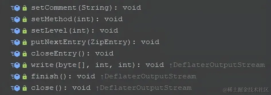 我们需要传入一个 OutputStream 对象。因此我们也大致可以认为 压缩文件 相当于是向一个 压缩文件中写入数据,听起来可能会有点绕。我们先看下ZipOutputStream中有哪些API: