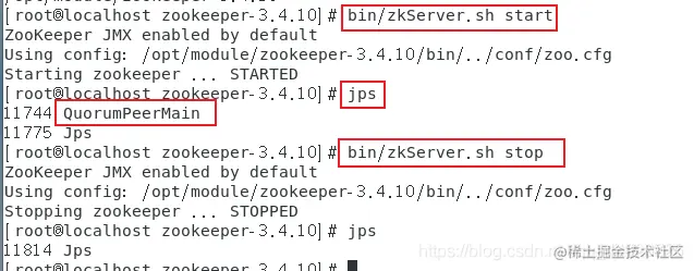 使用 jps 命令,如果 显示 QuorumPeerMain 则表示服务开启成功,zookeeper 安装成功。