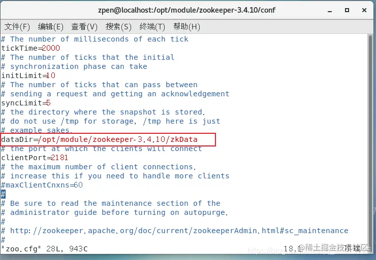 然后使用 下面命令 编辑 zoo.cfg 文件