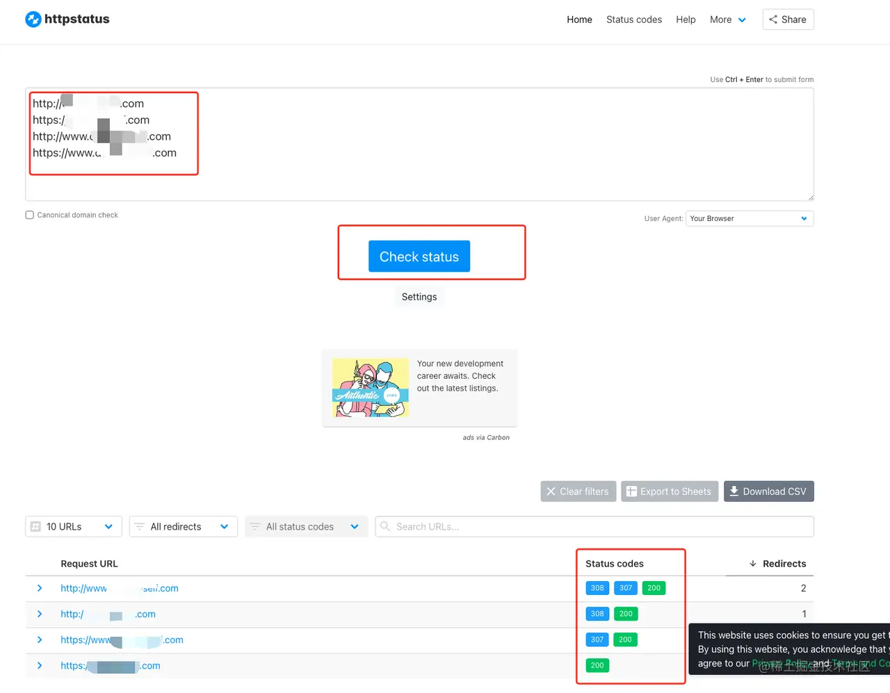 如何检测有没有设置好呢?可以在 httpstatus.io 网站上进行检测,输入你的这4个网址,正常的话,你可以看到结果如我下面的图片上显示的差不多。图片中的 status code 具体的含义,你鼠标盖上去的时候,它会解释含义。