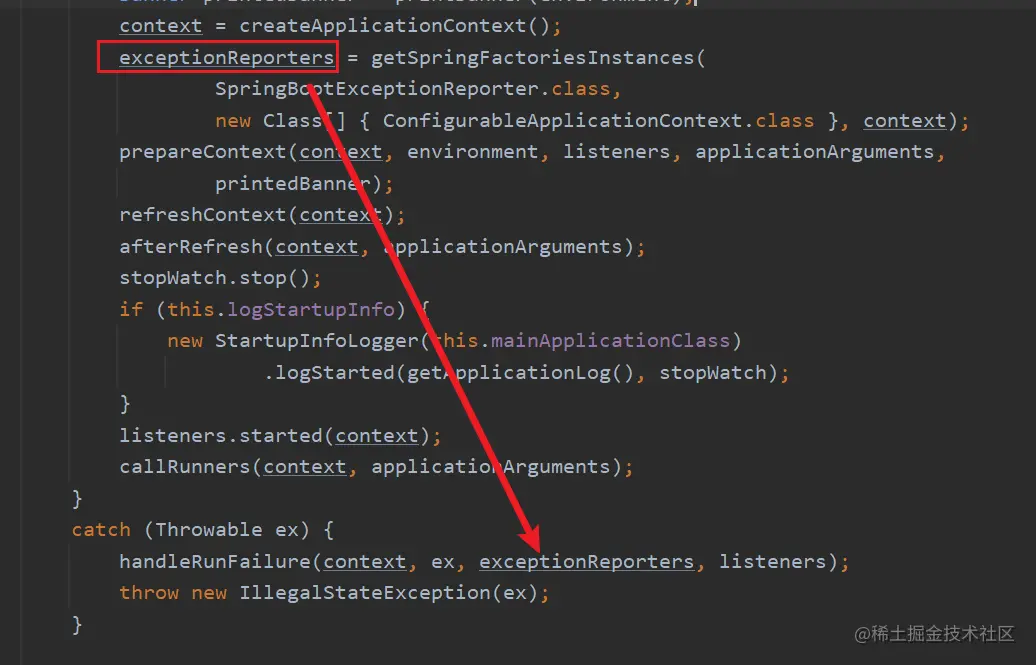 又见到熟悉的 getSpringFactoriesInstances() 方法了, 这里是获取 key = SpringBootExceptionReporter 的类并实例化.