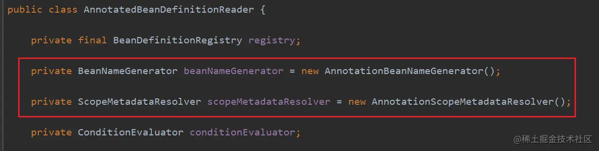 在调用构造方法前, AnnotatedBeanDefinitionReader 类中有两个属性, 还需要进行初始化, 如下: