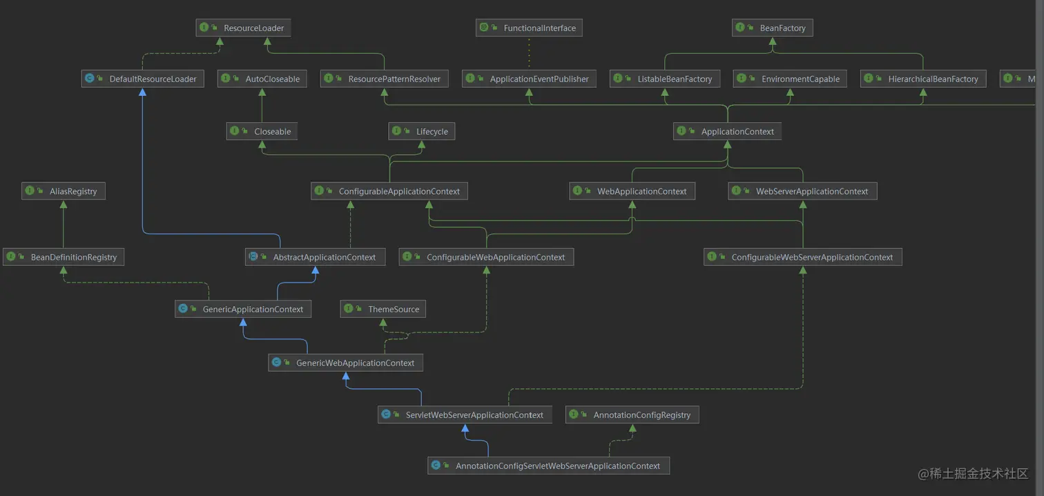 查看 org.springframework.boot.web.servlet.context.AnnotationConfigServletWebServerApplicationContext的继承关系如下: