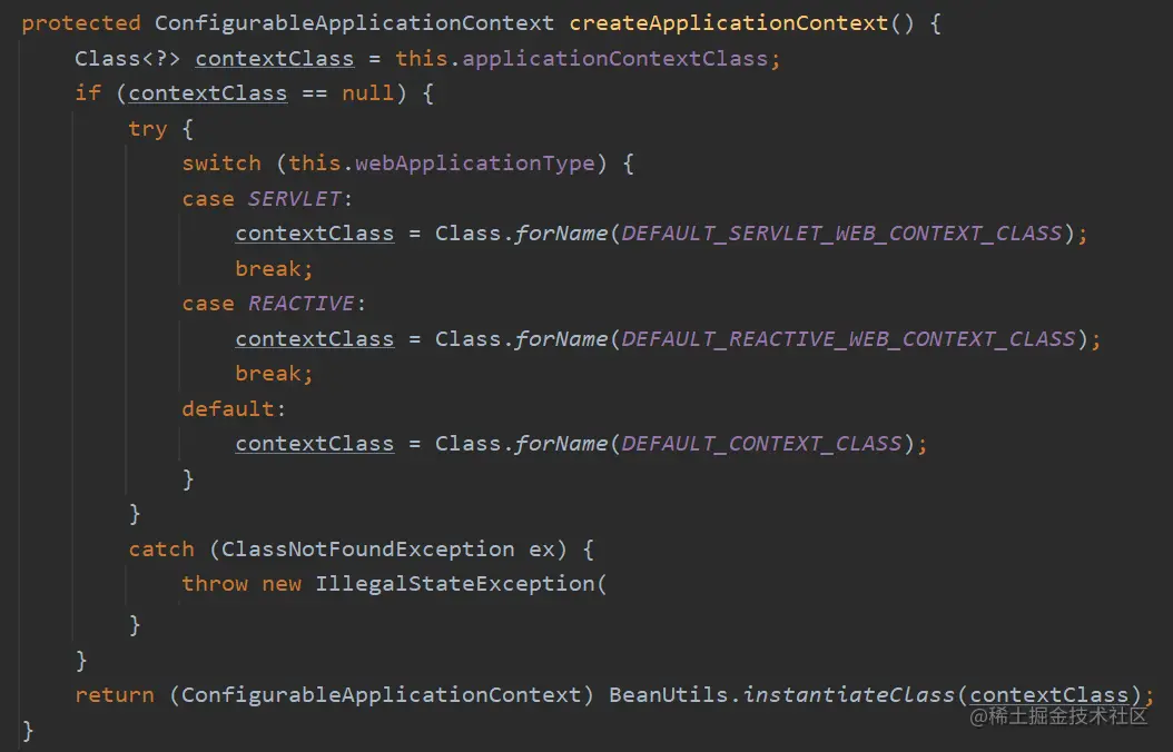 进入createApplicationContext()方法:方法内部根据应用类型, 然后使用反射创建对应的容器 context 类型.