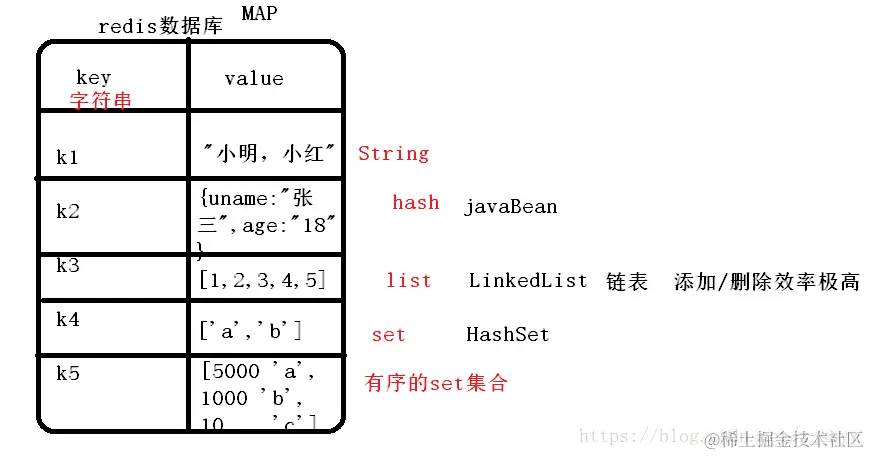 redis 使用的是键值对 保存数据。(map)