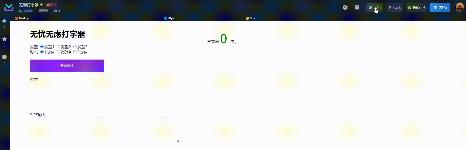 该打字训练器核心的部分都在vue中,前端涉及的比较简单,所以代码部分,不会过多介绍,来看下效果,整个页面分为几个部分,最上面是选择按钮,用于切换范文,而后是规定打字时间,接着便是开始测试按钮,最后是范文用用户输入框,整体效果如下: