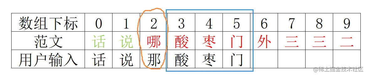 如何逐字对比呢? 可以将范文和用户输入的字符理解为数组,直接根据下标去对比就可以了,例如: