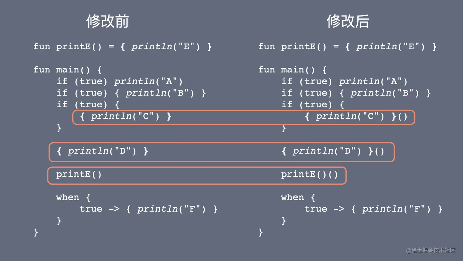 那为什么 C D E 没有打印,因为图中绿色部分是 lambda 表达式,在 Kotlin 中 lambda 表达式非常的自由,它可以出现在很多地方比如方法内、 if 表达式内、循环语句内、甚至赋值给一个变量、或者当做方法参数进行传递等等。