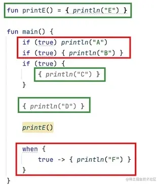 下面图中红色标注部分,if 表达式、 when ... case 表达,如果表达式内只有一行代码的话,花括号是可以省略的,程序执行到代码位置会输出对应的结果, 即 A B F。