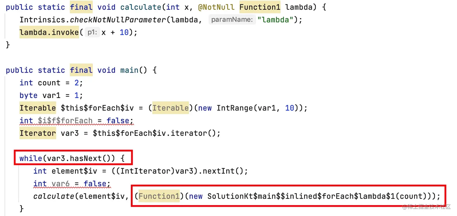 上面的代码其实存在一个比较严重的性能问题,我们看一下反编译后的代码。