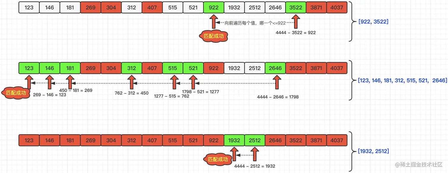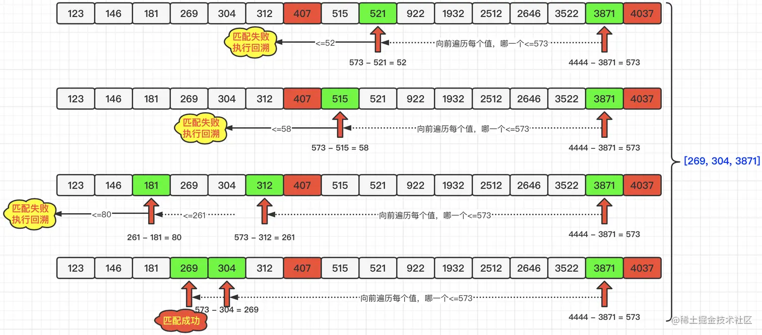 那么,寻找也并非一帆风顺的,比如:当我们继续遍历3871时,与4444的差值为573,我们向前寻找小于等于573的元素,找到512之后,计算差值为52,再向前寻找发现没有小于等于52的元素了,那就说明本次分组是失败了。我们就需要回溯操作了。什么是回溯呢?就是回到我们的上一步,继续匹配。具体流程如下图所示:
