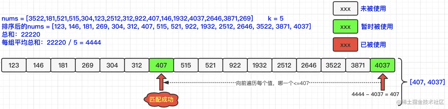 如果满足上面两个条件,我们就可以开始尝试进行分组匹配了。我们首先,从最大的元素开始遍历,再根据与每组平均总和的差值,再去继续寻找下面的元素,以下图为例,每组平均总和为:4444,最大元素为4037,差值为407;那么我们就需要再去寻找小于等于407的元素,发现在前面的元素中,存在407元素,那么匹配成功!为了防止被重复遍历,我们将4037和407都标记为已使用。如下图所示: