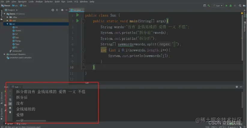 先写好编译环境,然后创建一个String字符串类型的words 在里面输入字符串,要拆分的地方,可以用空格或者用逗号等进行被标记,用于split关键字读取,然后进行一个拆分前print打印输出 提示,再打印拆分后打印输出提示,创建一个String[]数组类型的newword 用于储存拆封后的子字符串,通过words.split的方式进行关键字的调用,最后再通过一个循环进行了一个打印输出,在循环条件这里又使用了一个length函数,增强了程序的灵活性、复用性。通过打印分别输出了拆分后的字符串。