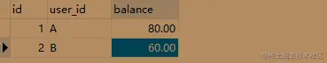 - INSERT INTO `test`.`account` (`id`, `user_id`, `balance`) VALUES (1, 'A', 80.00); INSERT INTO `test`.`account` (`id`, `user_id`, `balance`) VALUES (2, 'B', 60.00);