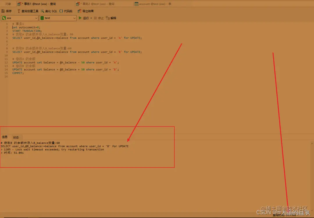 主要是因为事务1和事务2存在相互等待获取锁的过程,导致两个事务都挂起阻塞,最终抛出获取锁超时的异常。